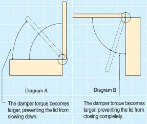 1.TRD-N1 je navržen tak, aby generovat velkého točivého momentu těsně před víkem, zavírání z vertikální polohy, jak je znázorněno v diagramu A, přijde na úplné uzavření. Když víko z vodorovné polohy, jak je znázorněno v diagramu B, silný točivý moment je generován těsně předtím, než uzavření víka, způsobující víko není řádně uzavřeny. |